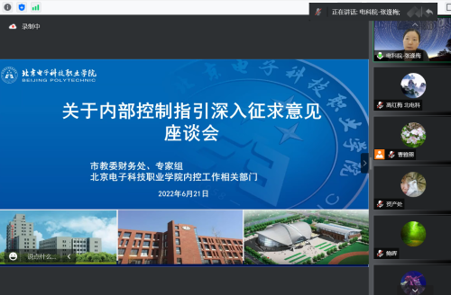 为切实提升教育系统内部控制建设工作水平,加强对各单位内控建设指导,提高内部管理水平和风险防范能力,教委财务处在4月中旬全面征求意见的基础上,深入征求重点单位的意见和建议。2022年6月21日,由教委财务处牵头,内部控制文件撰写组的专家与BEAT365通过腾讯会议进行了线上沟通交流,征求意见和建议。教委财务处副处长李琦,专家组和学校财务处、资产处、科技处、审计处、党政办公室、人事处、后勤基建处、信息中心8个部门的部门领导和各岗位的负责人共35人参加了此次讨论会。