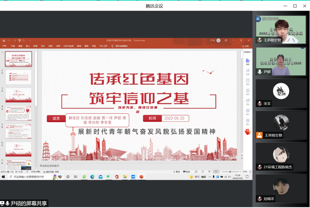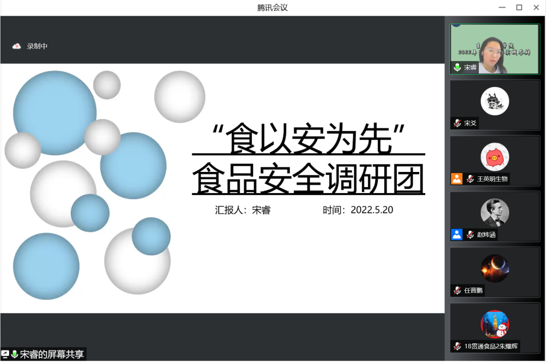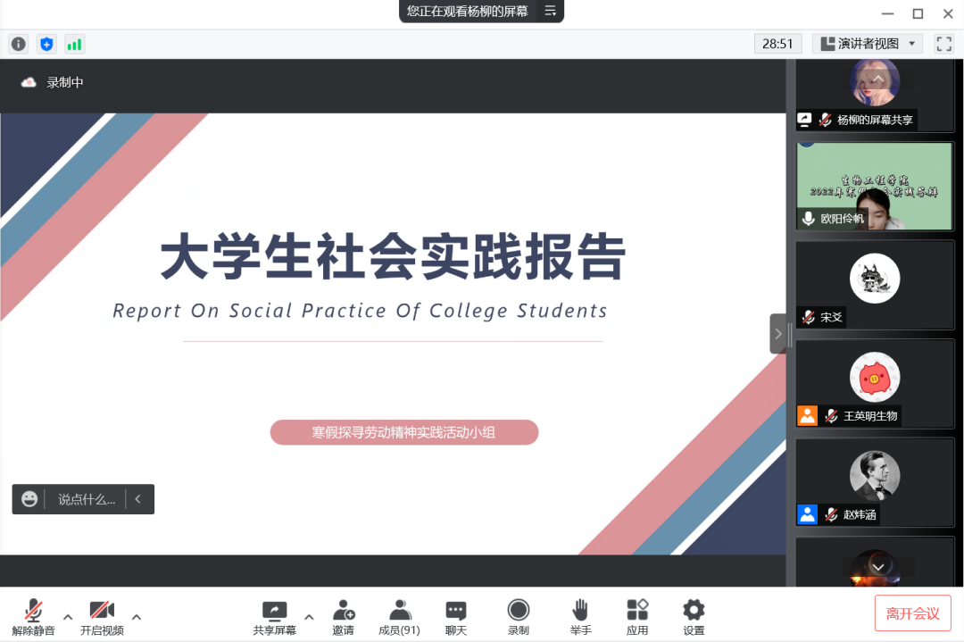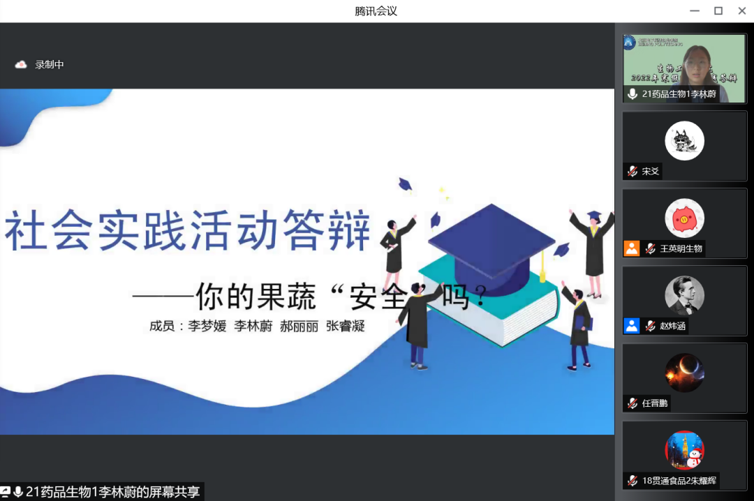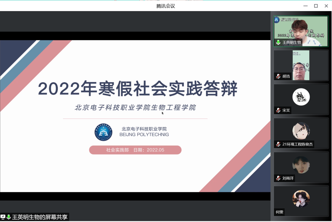 五月,是欢庆劳动者汗水的日子,是纪念青春历史的日子,更是寒假实践归来总结展示的重要时期。为进一步推广社会实践活动,展示寒假社会实践的丰硕成果,提高同学们参与社会实践活动的积极性。5月20日下午,生物工程学院举行2022年寒假社会实践线上答辩会。辅导员胡浩老师及14支团队参加,社会实践部负责人王英明同学主持。