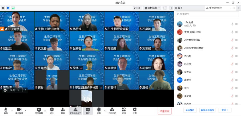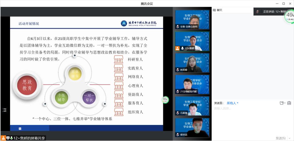 生物工程学院始终坚持以学生为中心,在学业辅导过程中,多次组织调研,深入了解学生的辅导需求,动态调整辅导内容。通过组织学生学业辅导座谈会,深入了解学业辅导效果,部署接下来的学业辅导工作。自6月3日以来,生物工程学院在21级高职学生中累计开展线上团体辅导8次,参与学生人数258人次,辅导内容涵盖高数,有机化学,生物化学和人工智能等多门学科;同时丰富辅导载体,建立了21高职学业互助微信群,鼓励优秀学生担任学业辅导志愿者,承担群内答疑工作,现有志愿者人数31人,群成员数95人。此外,对于学习难的学生建立了一对一辅导机制,充分发挥朋辈帮扶作用,累计建立帮扶小组45组,帮扶对象45人。生物工程学院环境系教师路鹏也参与到此次学业辅导中,形成了第一课堂和第二课堂的同频共振,构建了师生学习共同体。