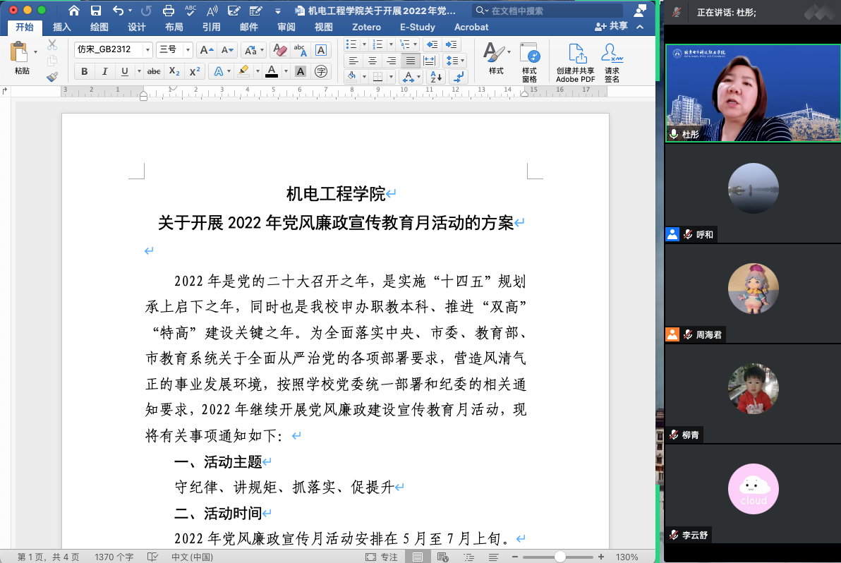 最后,杜彤同志强调,党风廉政建设宣传教育月活动为我们创造了常态化学习的平台,通过学习、实践和再学习的过程,能够使我们进一步提升政治站位、增强廉洁意识、加强底线思维,同时对进一步完善学院各项工作机制,提升学院发展的质量和效果提供催化剂。各党支部要落实好党风廉政宣传教育月的各项活动,高质量开展好本部门的党风廉政教育。教职工要以此为契机,加强政治理论学习,切实做到知责、履责、明责、守纪,主动作为,为营造风清气正的学院文化氛围和育人环境不懈努力。