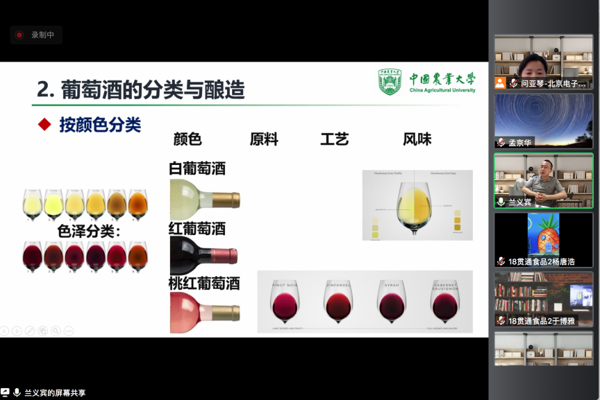 报告人从我国葡萄酒的起源与历史、葡萄酒的分类与酿造、葡萄酒的健康与消费、葡萄酒的选购与储存、葡萄酒品质的品鉴等方面进行介绍,回答了同学们和消费者普遍关心的问题如“鲜食葡萄与酿酒葡萄有什么不同”“如何选购到好的葡萄酒”“葡萄酒年份越久越好吗”等。重点介绍了进行专业葡萄酒品质鉴赏的各个环节:葡萄酒的饮用温度、酒杯的选择、品鉴顺序和品鉴方法。兰义宾老师从一名专业品酒师的角度向同学们展示了闻、观、品、体四个葡萄酒品鉴步骤和品鉴要点,并介绍了由所在实验室中国农业大学葡萄与葡萄酒中心建立的“中国葡萄酒感官评价体系”,更适合中国葡萄酒品质分析的葡萄酒描述分析表。