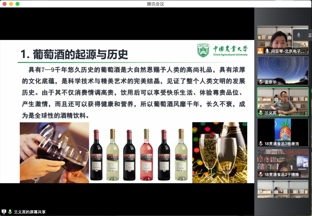 先锋大讲堂第三讲以18级贯通食品专业课程《食品感官评价》为基础,以“葡萄酒历史、葡萄酒文化、葡萄酒鉴赏”为主题,特邀中国农业大学教师、硕士生导师兰义宾博士做了“葡萄酒历史和品鉴”的主题报告,18级贯通食品班和部分专任教师聆听了此次报告。