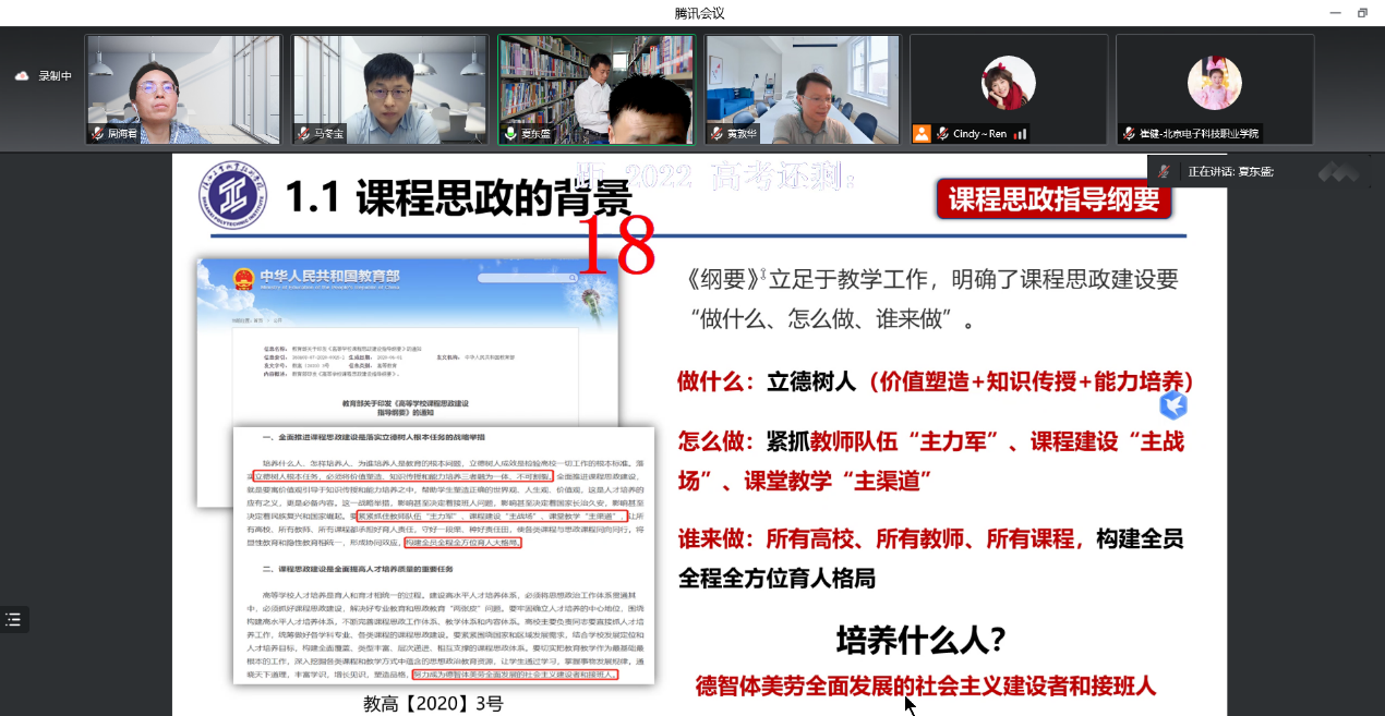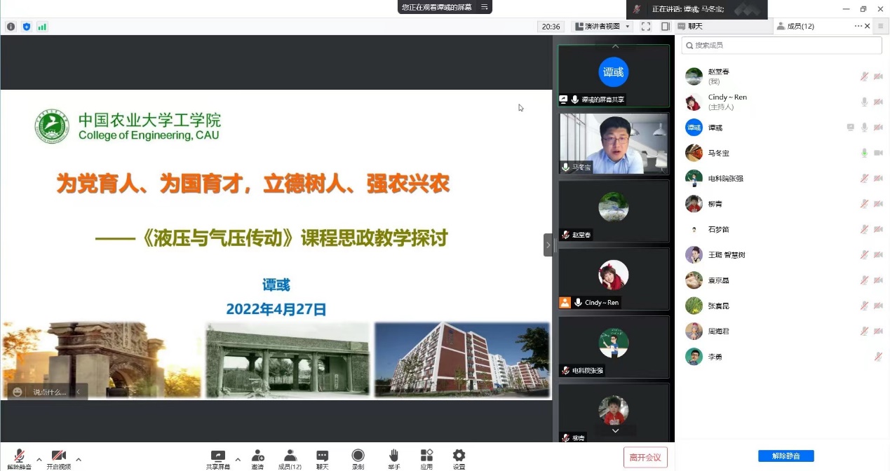 课程思政建设是构建立德树人长效机制、实现三全育人的一项战略举措。为更好地完成学校课程思政示范课申报工作,全面推动课程思政改革创新,提升课程思政建设水平,近期机电技术系邀请了中国农业大学谭彧教授和陕西工业职业技术学院夏东盛教授分别对《液压与气压传动》和《PLC控制技术》两门课程的课程思政建设经验进行线上交流分享,机电系全体教师积极参加研讨交流。