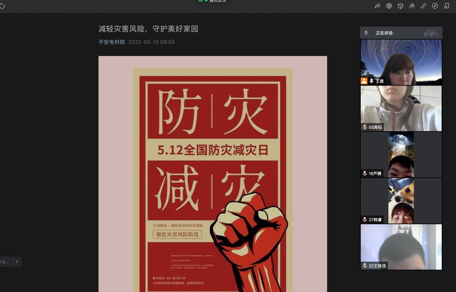 在第14个全国防灾减灾日来临之际,为进一步深入宣传防灾减灾知识,增强广大师生的防灾减灾意识,5月13日下午,基础教育学院组织了“减轻灾害风险 守护美好家园”主题班会课。主题班会课在各班班主任老师的指导以及班级学生的精心策划下,在线上召开。