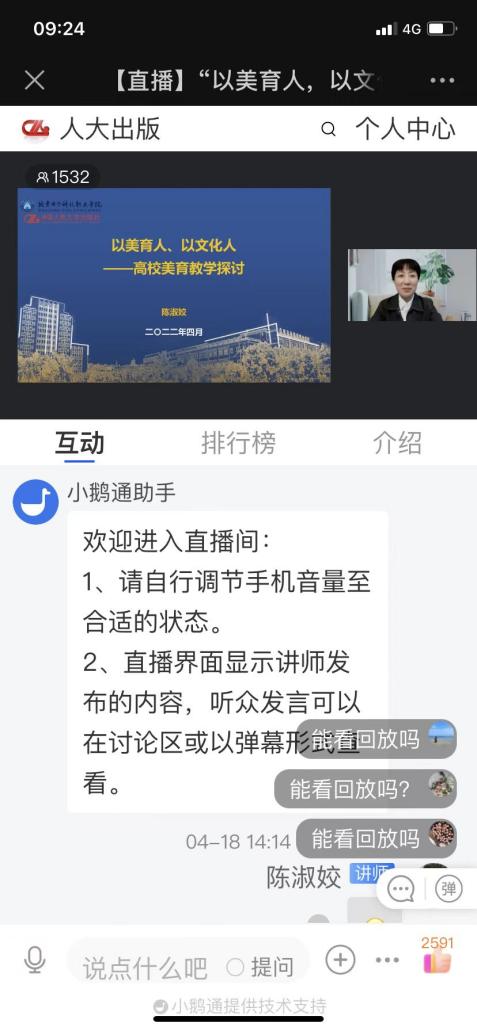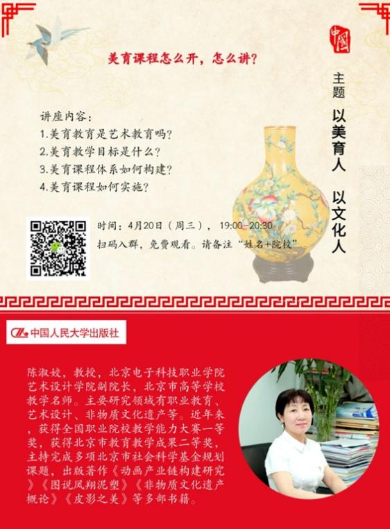 4月20日,艺术设计学院陈淑姣教授受中国人民大学出版社的邀请,在人大出版社直播平台上作“以美育人,以文化人——高校美育教学探讨”专题讲座,来自全国各高校的共1500余名教师在线听了讲座。