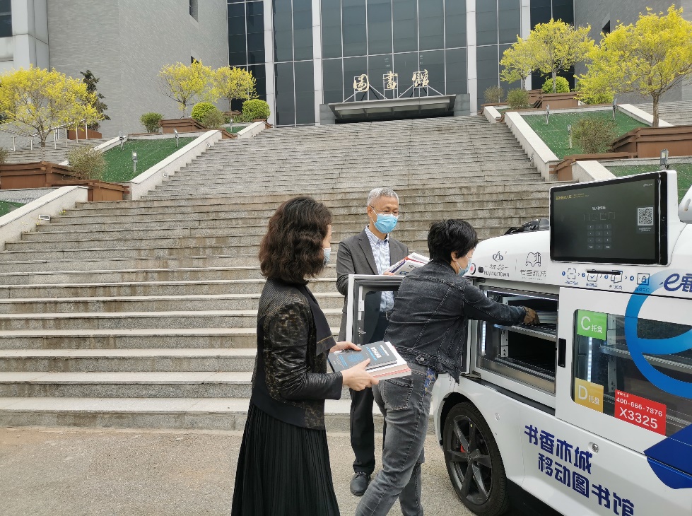 2022年4月21日上午,正值第27个世界读书日来临之际,无人送书车开进了学校大门,安全平稳地停在了图书馆门口。副院长辛秀兰给这辆无人送书车放入了第一批读者预借的图书。辛院长表示,把智能汽车的自动驾驶技术和图书馆的日常业务工作有效结合起来,将大大提升图书馆的智能化水平,也体现了图书馆真正意义上为读者服务的宗旨,为经开区文化建设助力。在疫情防控的背景下,学校图书馆在宣传文化部指导下与新石器科技有限公司共同推动的“移动借阅”合作,让经开区读者更安心、便捷地享受阅读的乐趣,充分展现了“科技+书香”的力量。