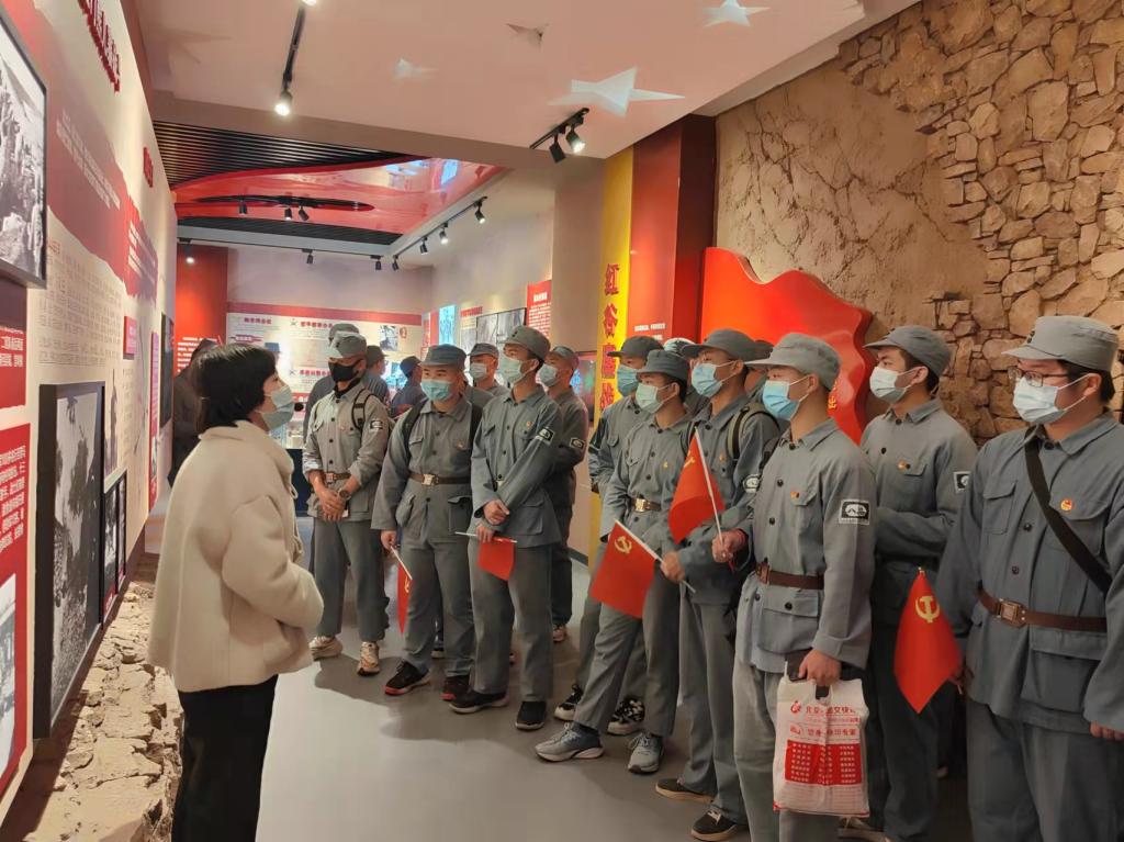 上午十时许,师生一行抵达平谷桃棚村,换上八路军军装,重走抗战小路,重温红色记忆。在红谷主题教育馆,通过历史实物、图片图表、油画雕塑、实景还原、交互式沉浸体验、多媒体声像等多种展示手段,生动还原了抗日战争时期平谷第一个党支部在洪崖洞诞生的历史和冀东地区可歌可泣的革命故事。特别是红谷鏖战展区,以场景复原和叙事播放的形式展示了平谷最壮烈的突围战——官庄战斗,实景还原、投影故事、弹孔展示,让师生身临其境感受当年艰苦卓绝、浴血奋战的抗战历史。