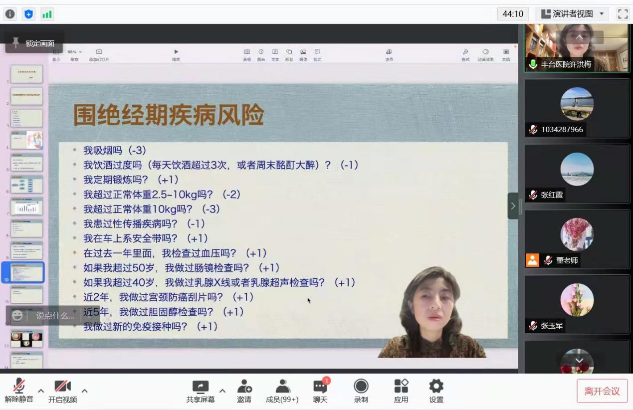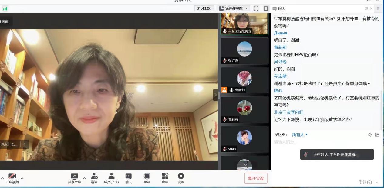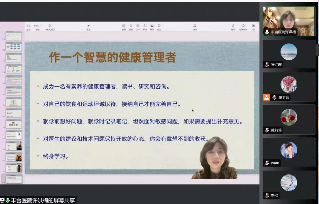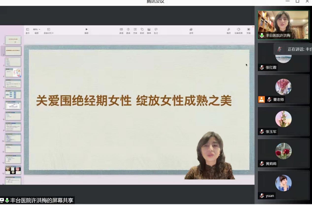 3月26日晚,由学校工会、女工委员会举办的庆“三八”国际劳动妇女节第二期健康讲座以视频会议形式如期举行。讲座特邀北京丰台医院妇科主任医师许洪梅为BEAT365广大中年女职工普及围绝经期保健知识。女工委员会主任董锋主持活动,120余名女教职工聆听了讲座。
