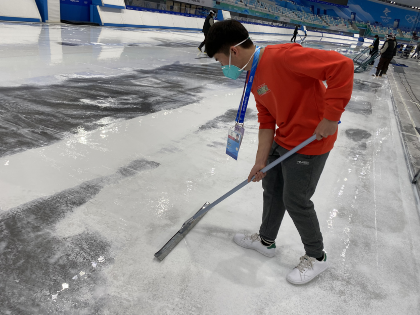 经过前期的自愿报名,并通过双冰场馆的选拔与考核后,最终张强等10名学生以制冰助理的身份参与双冰场馆的制冰工作,助力冬奥会。他们从1月初就进入闭环的管理模式,一直到冬残奥会结束,近三个月的时间,将失去与家人团聚的机会,坚守岗位,每天早上7点30分到达比赛场馆,晚上8点才能回到酒店休息,虽然工作比较辛苦,但是同学们都表示干劲十足。“就等这一刻到来了,如今能够参加冬奥会,实现了自己的一个梦想,能够用上自己所学的专业知识,协助制冰师进行制冰工作,服务冬奥会有种很强的自豪感与责任感,为打造冬奥最快的冰而努力奋斗”,学生张强如是说。