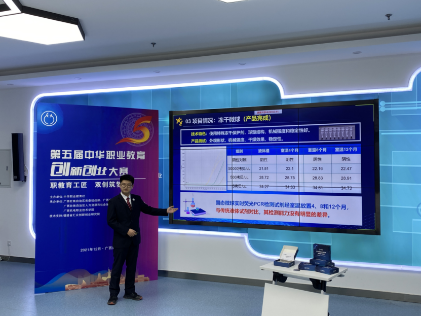 经网上团队报名、高校初评、专家网络评审共有来自全国30个省(区、市)122所职业院校的135个项目参加决赛。我院首次参加该项赛事,生物产品检验检疫专业学生段彦旭领衔的《新球战疫:PCR核酸检测试剂新型冻干微球》项目以北京市第一名的成绩晋级决赛,经过网络初筛、复赛现场答辩和决赛远程答辩等环节获得全国三等奖的好成绩。