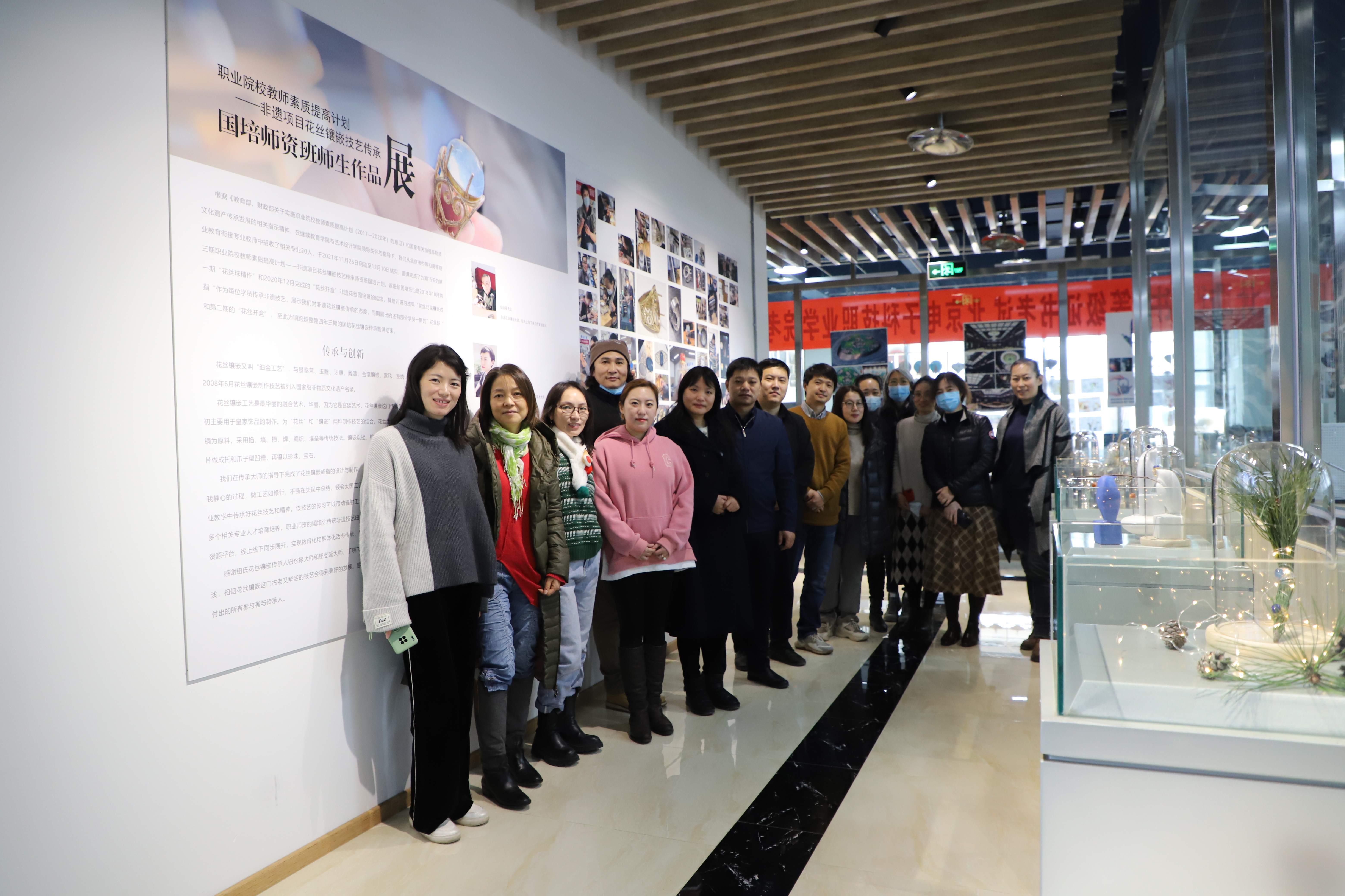 11月26日——12月10日,艺术设计学院圆满完成了第三期职业院校教师素质提高计划——非遗项目花丝镶嵌技艺传承师资班国培计划。本次国培班邀请到了北京市工艺美术大师、中国非物质文化遗产北京花丝镶嵌代表性传承人钮冬蕊大师进行培训,国培学员们在大师的指导下完成了花丝镶嵌戒指的设计与制作。展览中,精美繁复的花丝镶嵌作品令人目不暇接,花丝衍生珐琅结合作品将花丝镶嵌技艺与珐琅彩完美交织结合,相辅相成,展现了学员们精细的技艺手法和独特的艺术创意。
