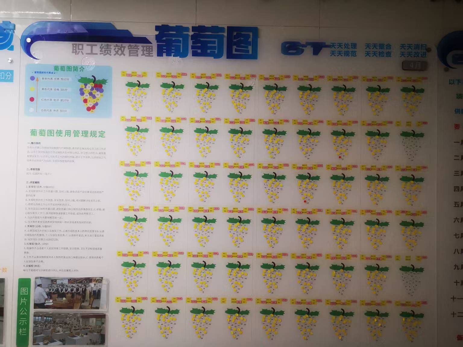食堂深入推行标准化、规范化、精细化管理,对工作流程进行全面梳理与优化,确保每一环节都有章可循、有据可依,进一步提升了食堂工作效率。同时,为进一步激发食堂员工积极性,教工食堂团队精心制定了员工绩效奖励制度与考核办法。该制度将工作标准量化,涵盖每日工作表现、每月综合评估以及学期末总评,全员参与考核评比。结合“葡萄图”管理模式,通过日评涂色、月评打分、学期总评登榜的方式,让员工对每日工作成果一目了然,精准呈现工作成效。对表现优异的班组与个人将进行表彰,在食堂内部形成积极向上、比学赶超的良好氛围,进一步激发团队合作精神。