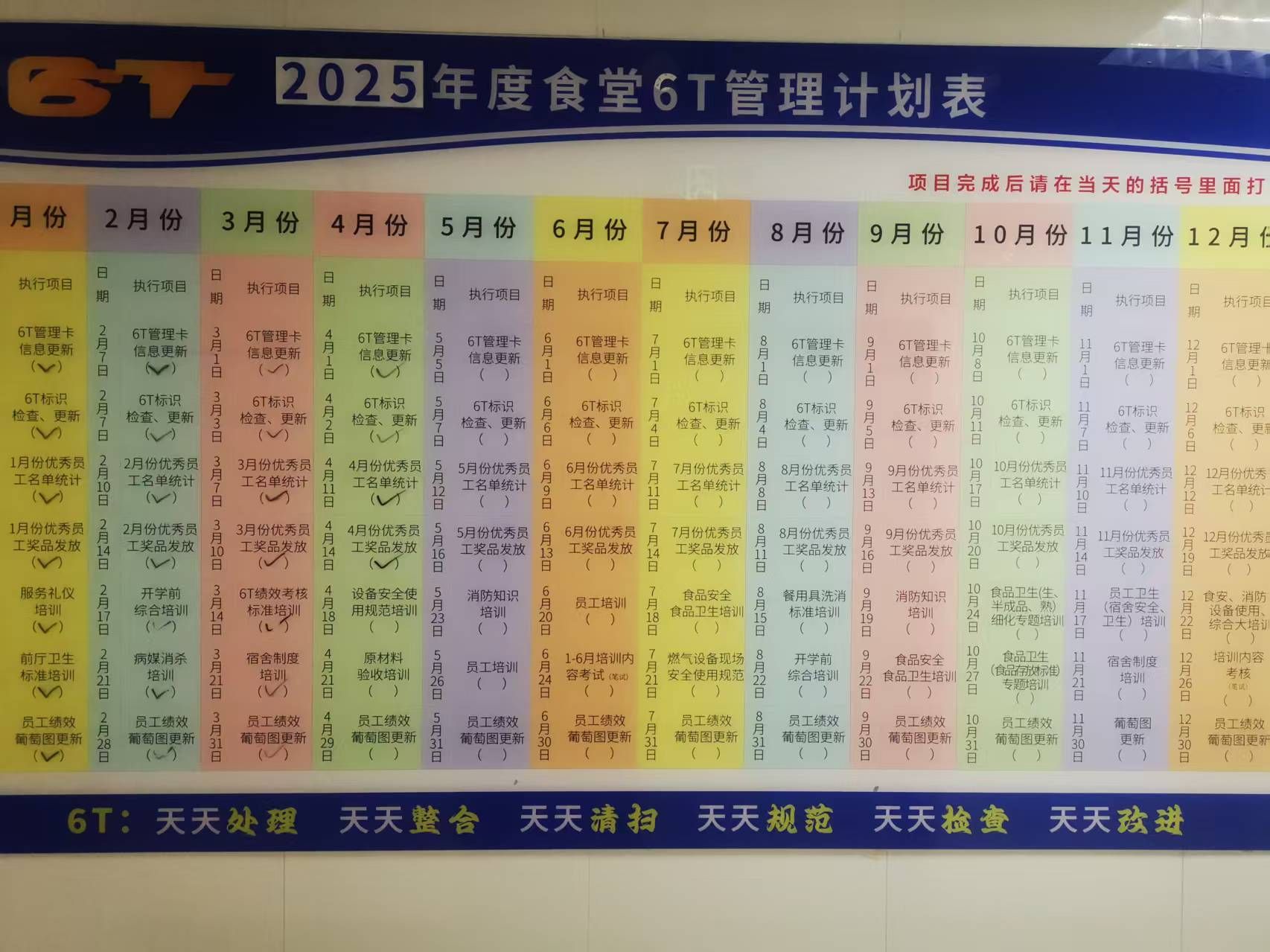 后厨作为食堂的核心区域,严格按照6T管理规范(天天处理、天天整合、天天打扫、天天规范、天天检查、天天改进)完善管理模式。从食材的采购验收、储存摆放,到加工制作、餐具清洗消毒,每一个环节都有明确的标准与操作流程。厨房环境时刻保持整洁卫生,设备定期维护保养,确保食品安全与卫生无死角。