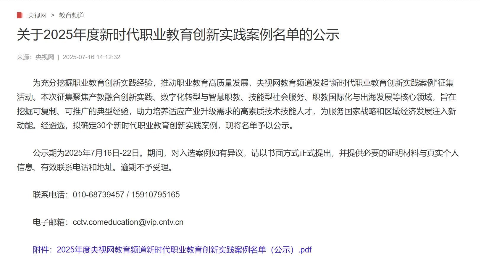 7月16日,央视网发布《关于2025年度新时代职业教育创新实践案例名单的公示》,生物工程学院报送的《“区-校-园-企”协同,“产-学-研-创”融汇 构建产城教融合新生态,打造高质量发展强引擎》入选实践案例名单。