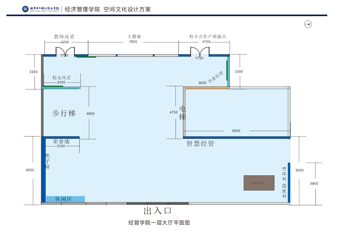 1.一层大厅总体建筑面积:418 ㎡,其中吊顶面积为:235㎡;“青年兴国家兴”面积为:25㎡;“智慧经管”面积为:37㎡;“电视墙+荣誉墙”面积为:36㎡;“校友风采”面积为:10㎡;“教师风采+主背景墙+校企合作”面积为:55㎡;“书香经管”面积为:20㎡。一层平面图如下: