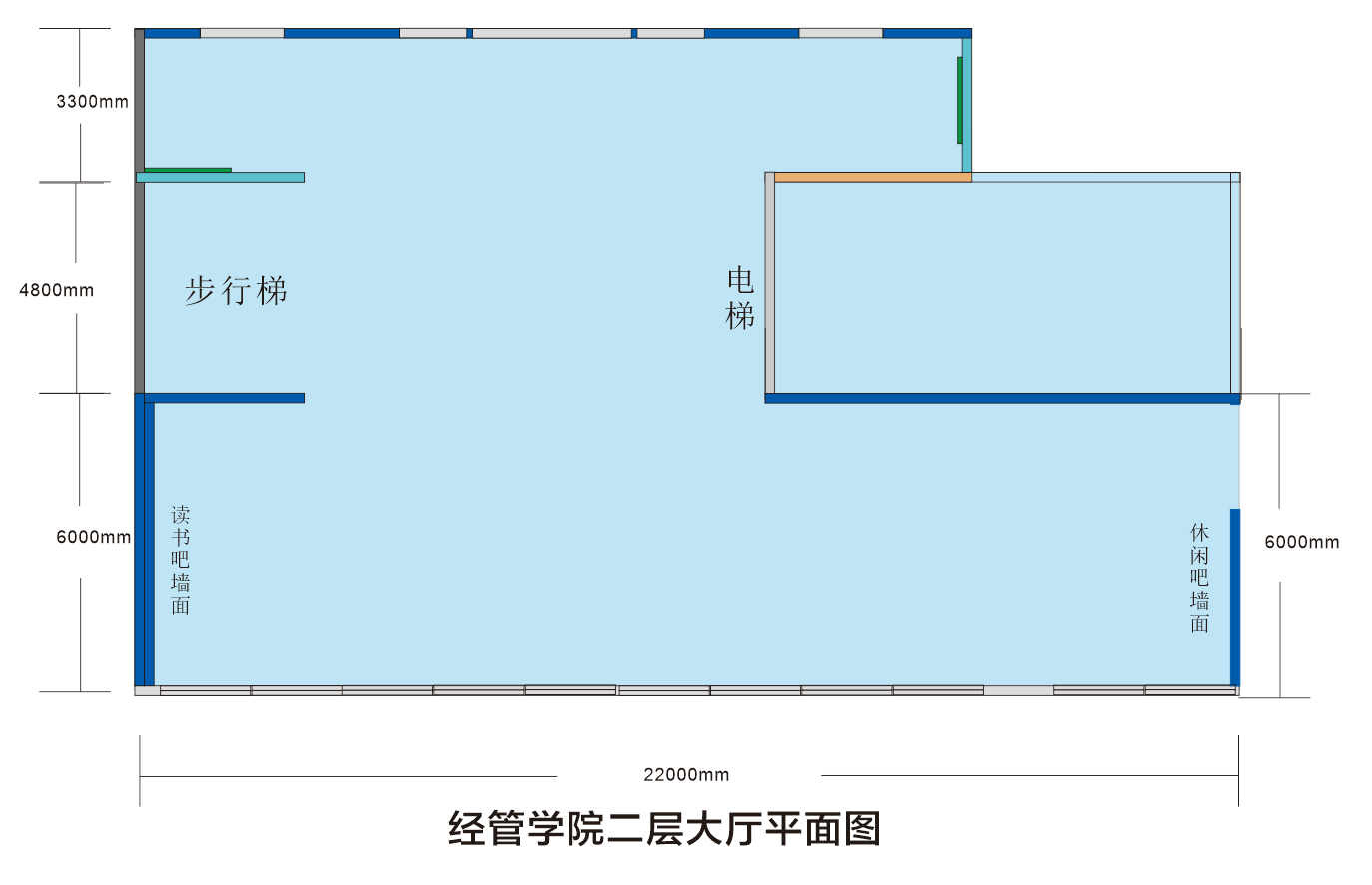 2.二层大厅总体建筑面积:265 ㎡,其中吊顶面积为:235㎡;北侧墙面“图书展示”面积为:15㎡;南侧“休闲空间”面积为:15㎡。二层平面图如下: