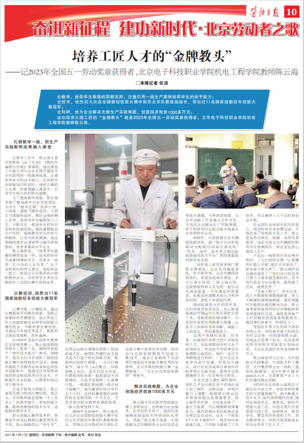 【劳动午报】培养工匠人才的“金牌教头”——记2023年全国五一劳动奖章获得者、北京电子科技职业学院机电工程学院教师陈云海
