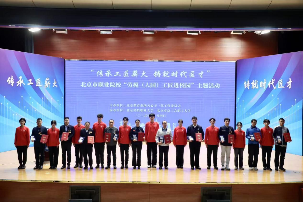 北京市委常委、教育工委书记于英杰在讲话中指出,劳模工匠“择一事终一生”的执着坚守和“干一行精一行”的卓越追求,深刻诠释了劳模精神、劳动精神、工匠精神“三个精神”的时代内涵,是广大青年学子学习的榜样。他强调,要以“三个精神”为引领,有机嵌入课堂教学和实践实训,持续深化“劳模工匠进校园”等活动,构建具有匠心特色的大思政课育人体系。要以产教融合为抓手,聚焦首都需求,构建高水平职业学校和专业群布局体系,推动普通高校、职业学校、技工院校与各行业龙头企业开展全链条人才培养和技术创新服务,一体推进教育、科技、人才发展。要以机制保障为支撑,充分发挥好各级教育系统关工委桥梁纽带作用,更多争取市总工会支持,整合学校、企业、社区等优质教育资源、实践资源与就业资源,凝聚首都职业教育发展合力。他寄语同学们以强国建设、民族复兴为己任,在为国奋斗、为民实干中实现个人价值,练就过硬本领,增强韧性定力,锤炼劳动奋斗之能,在追求理想的道路上昂扬前进。