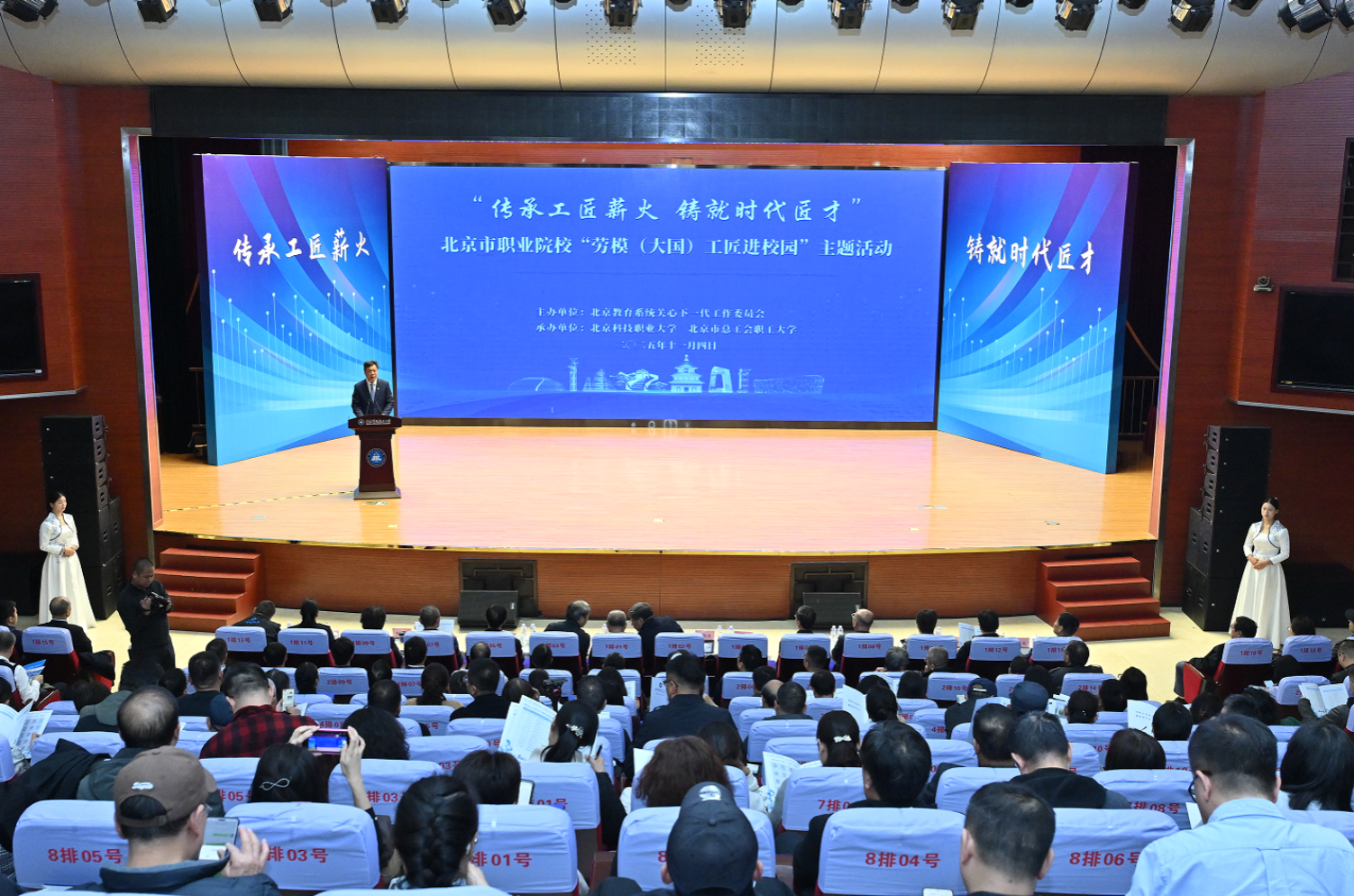 北京市委常委、教育工委书记于英杰在讲话中表示,劳模工匠“择一事终一生”的执着坚守和“干一行精一行”的卓越追求,深刻诠释了劳模精神、劳动精神、工匠精神“三个精神”的时代内涵,是广大青年学子学习的榜样。要坚持不懈用习近平新时代中国特色社会主义思想铸魂育人,以“三个精神”为引领,有机嵌入课堂教学和实践实训,持续深化“劳模工匠进校园”等活动,构建具有匠心特色的“大思政课”育人体系。要以产教融合为抓手,聚焦首都需求,构建高水平职业学校和专业群布局体系,推动普通高校、职业学校、技工院校与各行业龙头企业开展全链条人才培养和技术创新服务,一体推进教育、科技、人才发展。要以机制保障为支撑,充分发挥好各级教育系统关工委桥梁纽带作用,更多争取市总工会支持,整合学校、企业、社区等优质教育资源、实践资源与就业资源,凝聚首都职业教育发展合力。他寄语同学们以强国建设、民族复兴为己任,在为国奋斗、为民实干中实现个人价值,练就过硬本领,增强韧性定力,锤炼劳动奋斗之能,在追求理想的道路上昂扬前进。