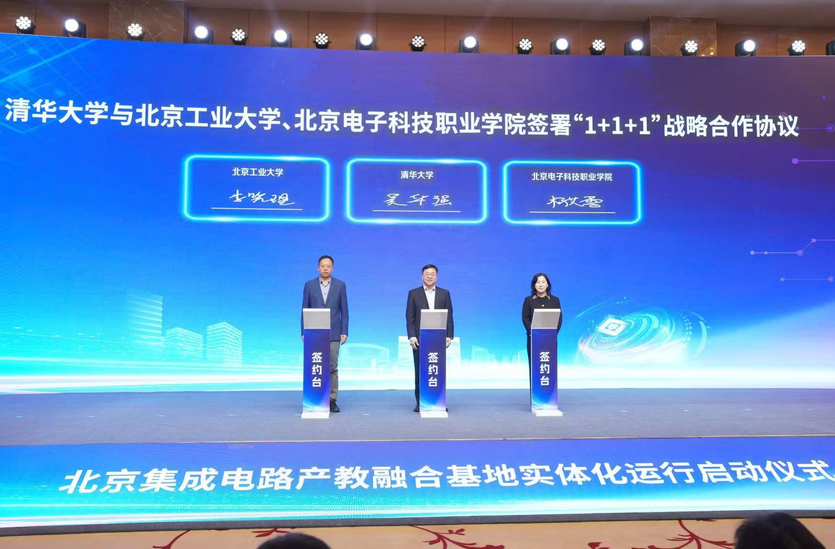 仪式现场,清华大学与北京工业大学、北京电子科技职业学院达成“1+1+1”合作意向,三方将依托产教融合基地,构建央属高校、市属高校、高职院校协同育人创新模式,服务首都经济社会高质量发展。
