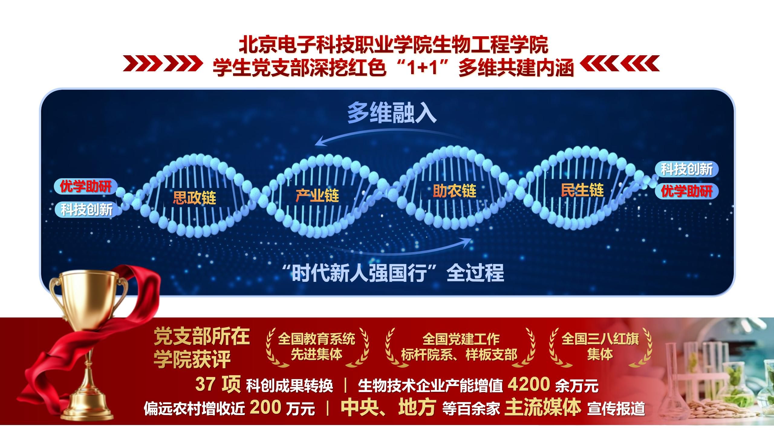 近年来,北京电子科技职业学院生物工程学院学生党支部深挖红色“1+1”多维共建内涵,以“优学助研”科技创新“双螺旋”为主线,构建“思政链—产业链—助农链—民生链”四链并行,多维融入“时代新人强国行”全过程。党支部所在学院获评“全国教育系统先进集体”、“全国党建工作标杆院系、样板支部”、“全国三八红旗集体”,完成37项科创成果转换,助力生物技术企业产能增值4200余万元,实现偏远地区每年农业增收近 200 万元,相关做法经验受到中央、地方等多家主流媒体关注。