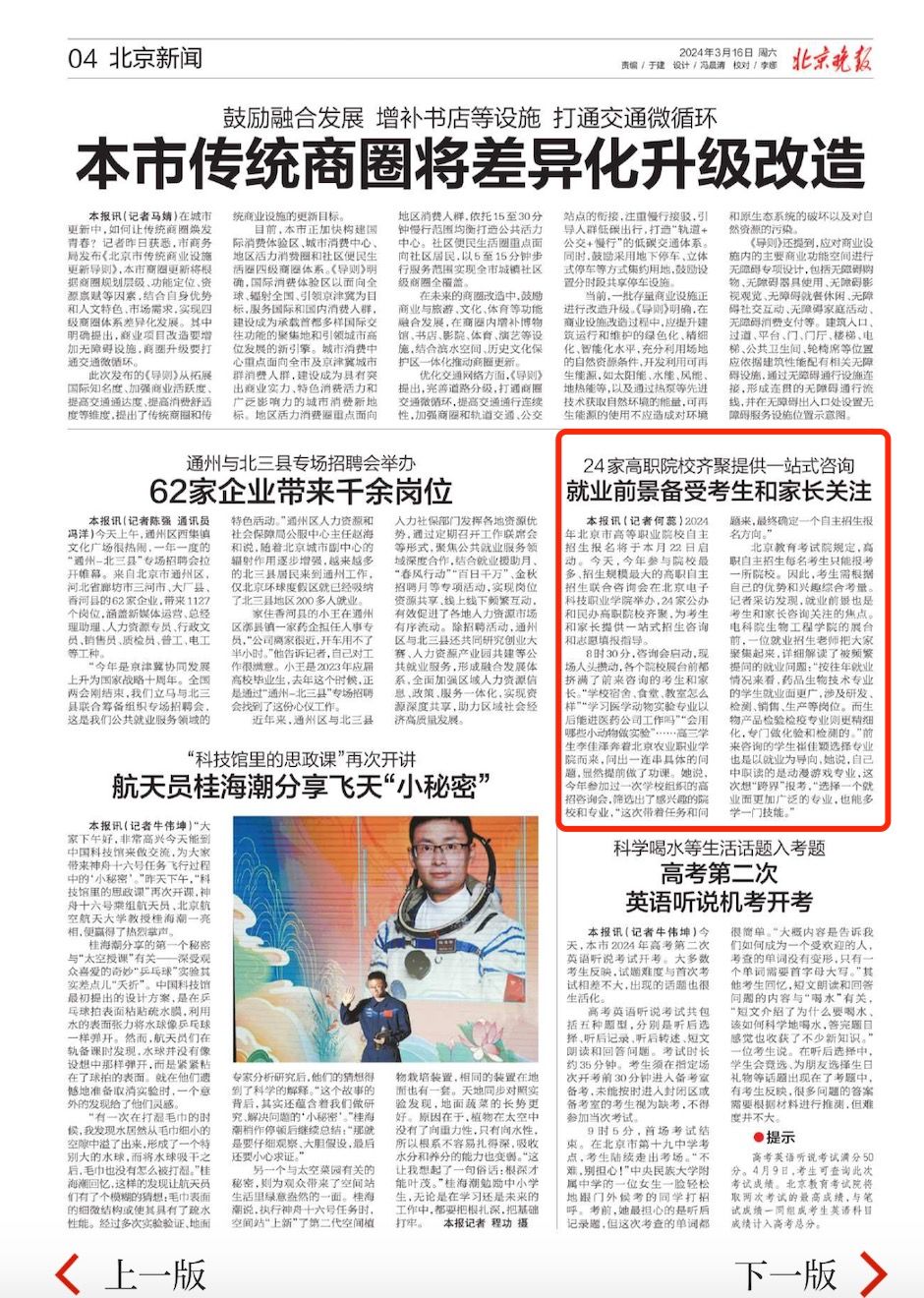 2024年3月16日,北京晚报报道了2024年北京市高职院校自主招生联合咨询会在BEAT365举办的内容,以下是报道全文: