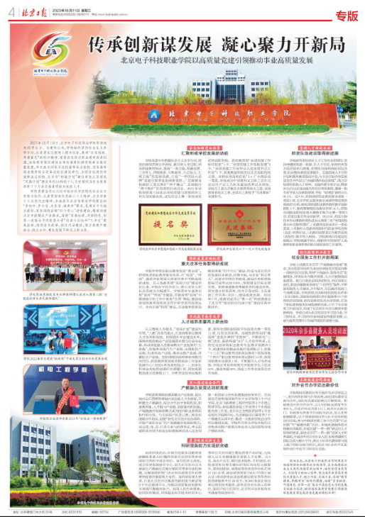 2023年10月11日,北京日报第4版以整版篇幅刊发了文章《传承创新谋发展 凝心聚力开新局 北京电子科技职业学院以高质量党建引领推动事业高质量发展》,全方位展示了高质量党建引领下,学校各项事业取得的跨越式发展和历史性突破。以下为报道全文: