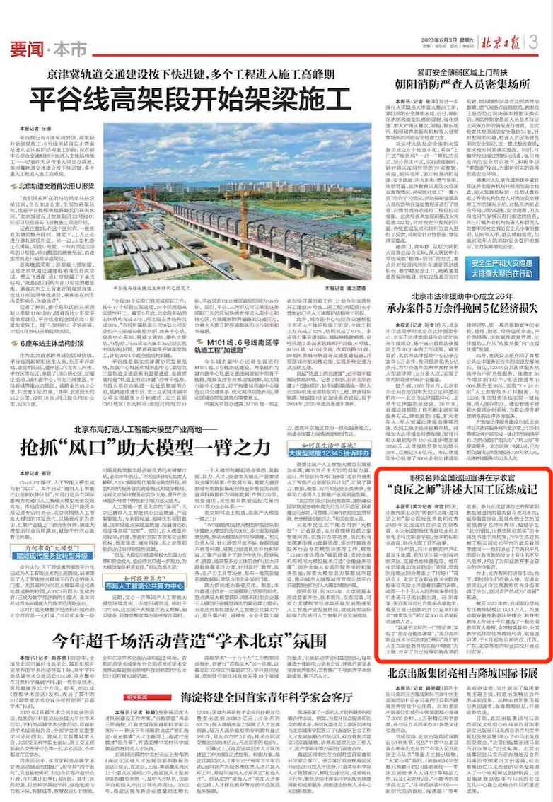 2023年6月2日,北京日报报道了“铸教师之魂·造良匠之师”职业院校优秀教师代表2023年全国巡回宣讲会(北京站)在BEAT365举行的内容,以下是报道全文: