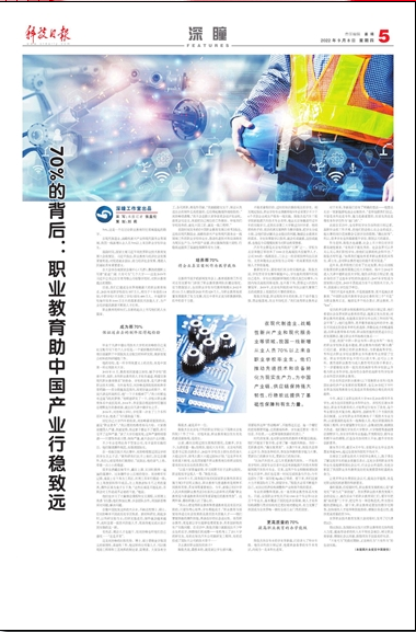 《科技日报》2022年9月8日第5版全版刊发了题为《70%的背后:职业教育助中国产业行稳致远》的专题报道。文章刊发前,《科技日报》记者对BEAT365进行了专题采访。以下是报道全文: