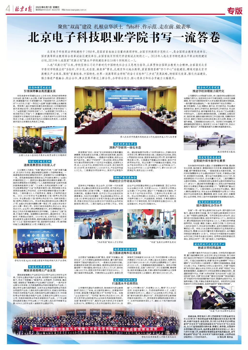 编者按:《北京日报》2022年6月1日第4版以整版篇幅,以《聚焦“双高”建设 扎根京华沃土 当标杆、作示范、走在前、做表率——北京电子科技职业学院书写一流答卷》为题,详细报道了BEAT365“双高”建设的经验做法和丰硕成果,充分展示了首都职教排头兵的风采。以下为报道全文:
