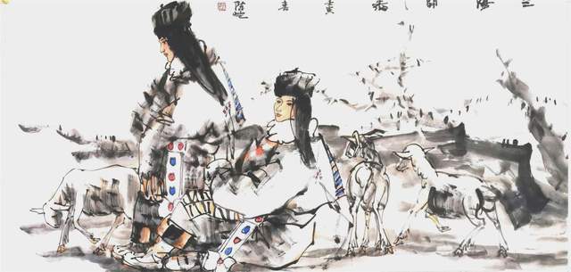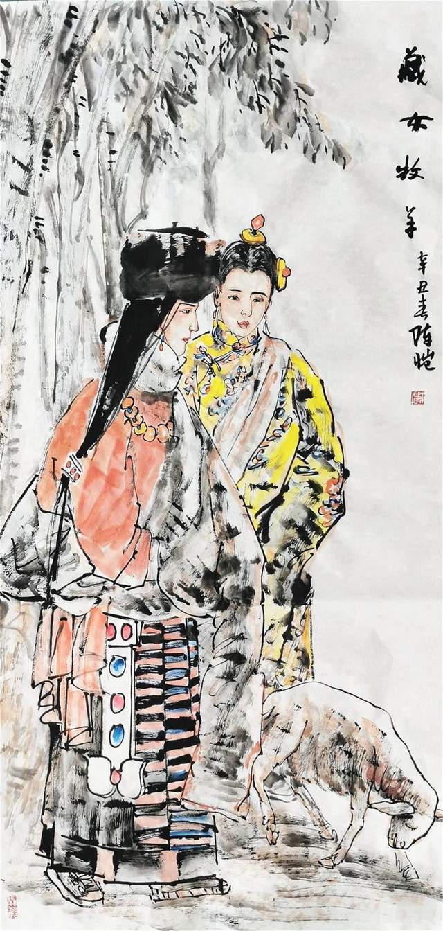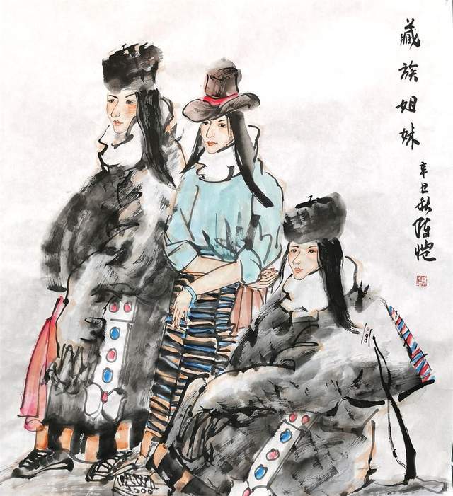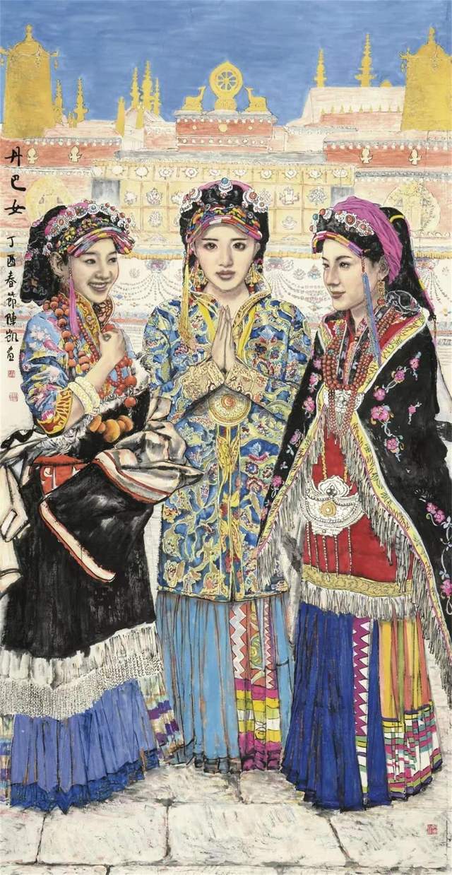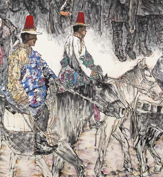 就作品中的人物刻画而言,陈恺在把握形态的造型方式上极富多样化。他将写实手法的规范、严谨与写意风格的生动、率意进行结合,以人物的五官轮廓与形体结构为基础,进行适度的夸张变形,用艺术语言的演绎造就了形象的独特魅力,并把握住了形象自身的外在因素,以符合于具体的情境表现:有的身穿彩色绸袍,飘逸灵秀;有的身穿僧侣红衣,典雅大方;还有的以现代装束示人,充满时代气息,在画面中,那些被一一表现的神态各异人群,在艺术语汇的归纳、取舍中,以不同的服饰特色,文化习俗形成身份区别,典型化的塑造中也涌动着真善美的情感诉求。
