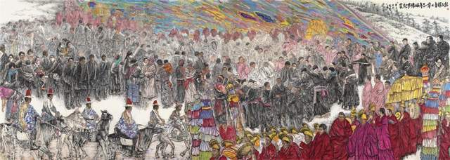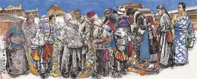 就画面中的境象构成来看:这不是一个平常的自然空间里发生的情节,这是集合了同一事件不同时段不同空间的构成。属于四维空间的创作,画面具象元素和意象元素相互交织,畅游其中的有前排扛着巨幅大佛画卷的红衣喇嘛、有骑着骏马的彪悍英俊男子、更有不计其数的参加活动的人群,其中有男有女有老有少、还有维持秩序的僧人,极尽各行各业之群众,当人物主体与这样的环境相融合,他们渗化于画面背景中,人与景同构为一种带有自然气息的文化景观。