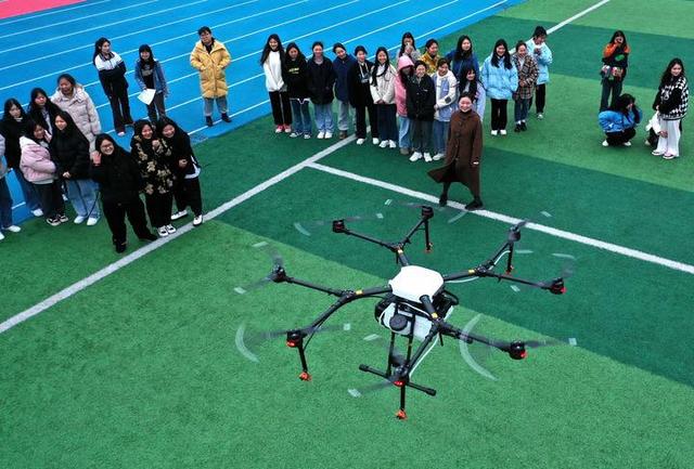 2022年3月2日,在宣恩县中等职业技术学校,学生观摩植保无人机飞行操作(无人机照片)