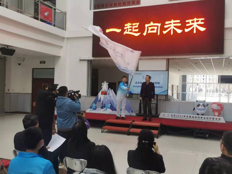 2022年1月11日,北京电子科技职业学院为冬奥会赛会志愿者举行了隆重的出征仪式。学院党委书记张启鸿对全体志愿者提出殷切期望,院长姚光业为志愿者授旗。志愿者王思凯的发言代表了大家的心声,“能够服务于北京冬奥会和冬残奥会是当代青年光荣而神圣的使命,我们将继承前辈们的优良传统,以饱满的精神状态和出色的技能为冬奥盛会提供一流服务,并为‘电科蓝’注入新活力。”