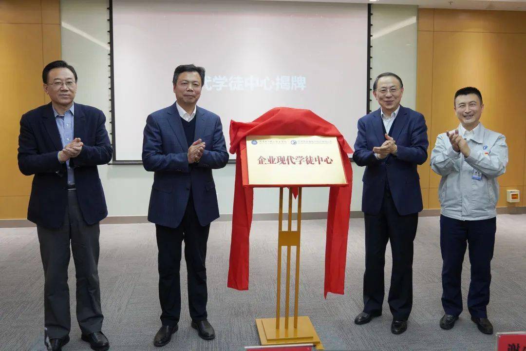 张启鸿、姚光业、谢小明、王海鹏共同为“企业现代学徒中心”揭牌。
