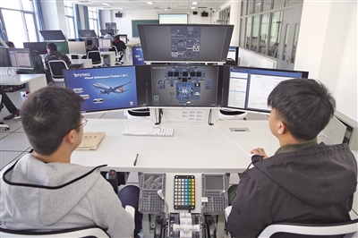 学生在实训室仿真维修中心练习飞机维修技能