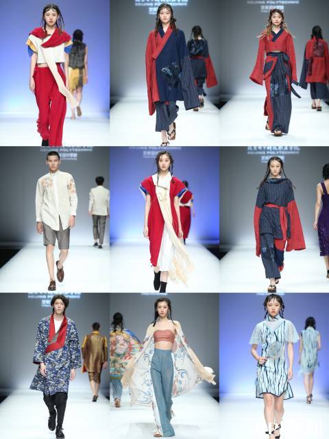 第三幕 希望:这一幕学生作品选用数码印花、印染、织秀等工艺,将敦煌元素、传统图案、水墨等元素融入现代服饰,体现出文化自信及对民族复兴的希望。