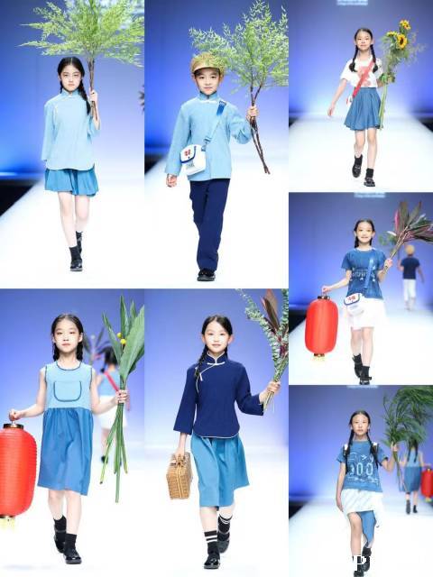 第二幕 信念:这一幕为小学生服装设计,可爱的小模特迈着坚定的步伐,身穿手工蓝印图案的T恤、“五四”青年风格的中式校服,朴素与怀旧的风格中,显示出初心与自信,表达从小对未来美好生活的热爱与坚定的理想信念。