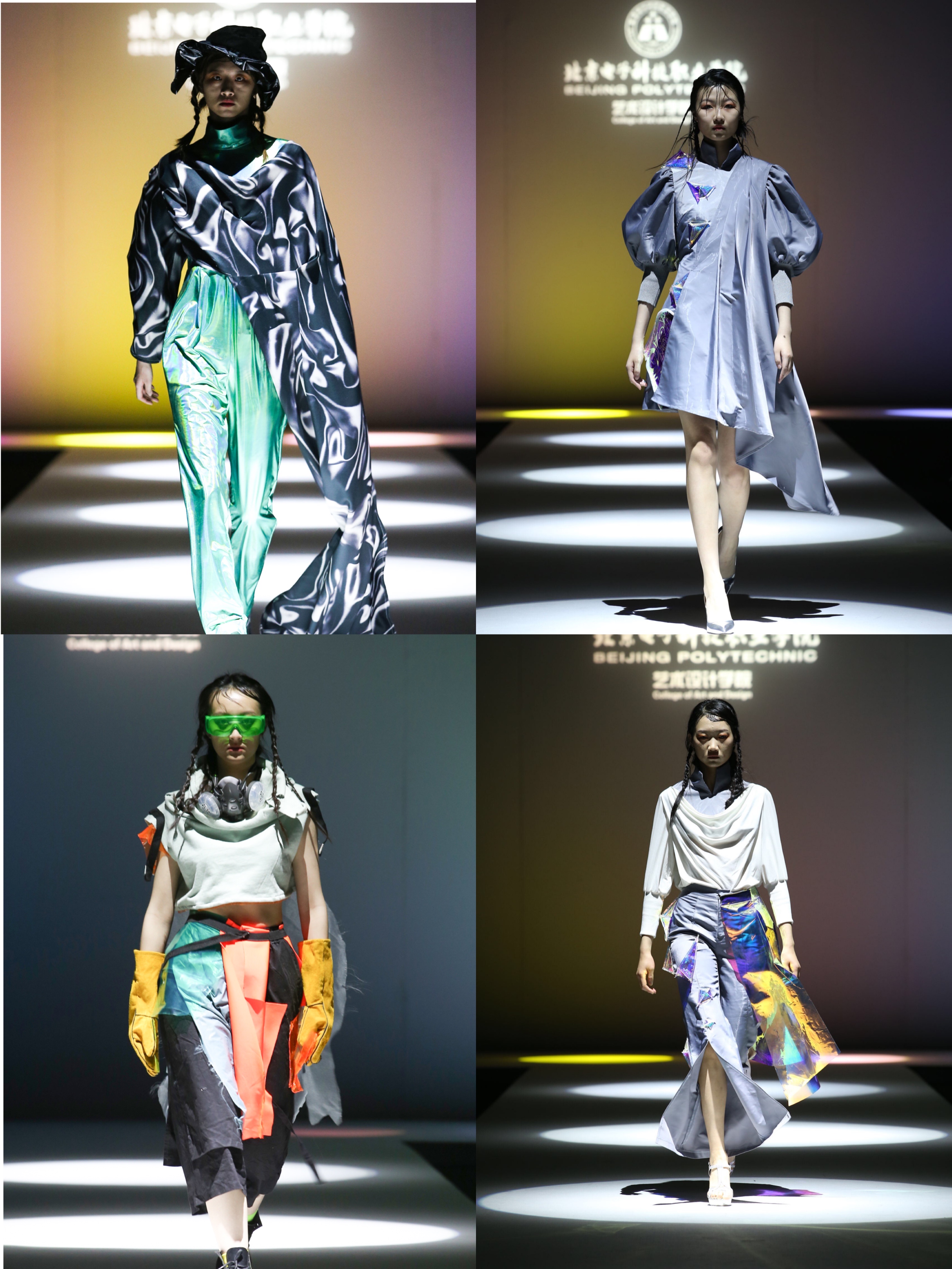 第一幕 碰撞:这部分作品结构独特,通过解构,装饰、版型自由变化等手段解读流行的奥秘。“环保元素”“资源空间”“智能科幻”等主题元素及新材料在服装上大量出现,反映了学生对未来与科技、人与自然及后疫情文化的深刻思考与责任担当,整体服装个性凸显,审美多元,彰显了设计师对主题的理解。