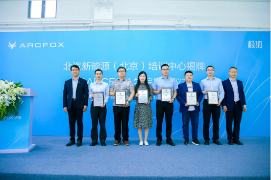 当天,北京电子科技职业学院院长姚光业,北京市职工教育协会副会长王佩英,北京经济技术开发区社会事业局就业促进处副处长王宁,北京电子科技职业学院副院长朱运利,北汽新能源人力资源总监胡凯膑、北汽新能源工会副主席周阳,北汽新能源ARCFOX事业部党委副书记万金朋等,共同为ARCFOX学院启用剪彩,并为校企合作受聘教师颁发了聘用证书。