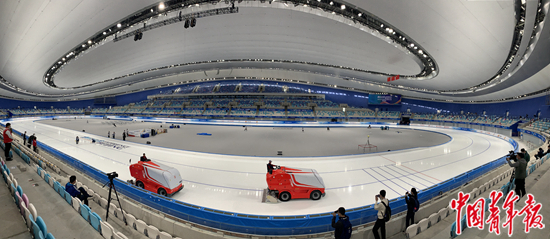 作为2022年北京冬奥会唯一新建的冰上竞赛场馆,“冰丝带”在这次测试活动中首次接受运动员竞赛检验。这条采用世界最先进、环保的二氧化碳制冰技术打造的赛道,由参与过5届冬奥会制冰工作的加拿大资深制冰师马克·麦瑟领衔,带领外方制冰团队和中方制冰团队共同完成,其中,还有包括鲁元哲在内的22名来自同一班级的“学生军”。