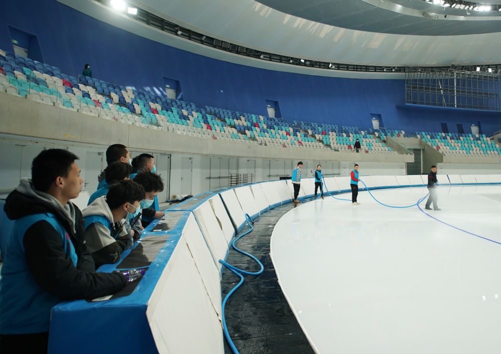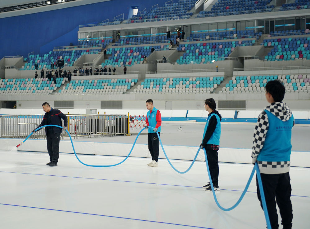 在观摩、协助国际制冰专家工作的过程中,这些同学很快感受到压力和挑战。“场地冻冰前,要用洗地机将冰板层的杂物、尘土清除,将围绕冰场的板墙缝隙逐一封严。制冰机组启动后,冰板层逐渐降温。再打开除湿机、空调机,将室内温度、湿度调整至最佳状态。然后,就是围绕赛道数百次的喷水浇冰,再加上喷漆画线,整个制冰计划将持续近14天。使用期间,还要不停维护冰况。”学生鲁元哲感叹,“给‘冰丝带’制冰就像玩一场特殊的解码游戏。冻冰、修冰、化冰的过程,就像一次次通关升级。”