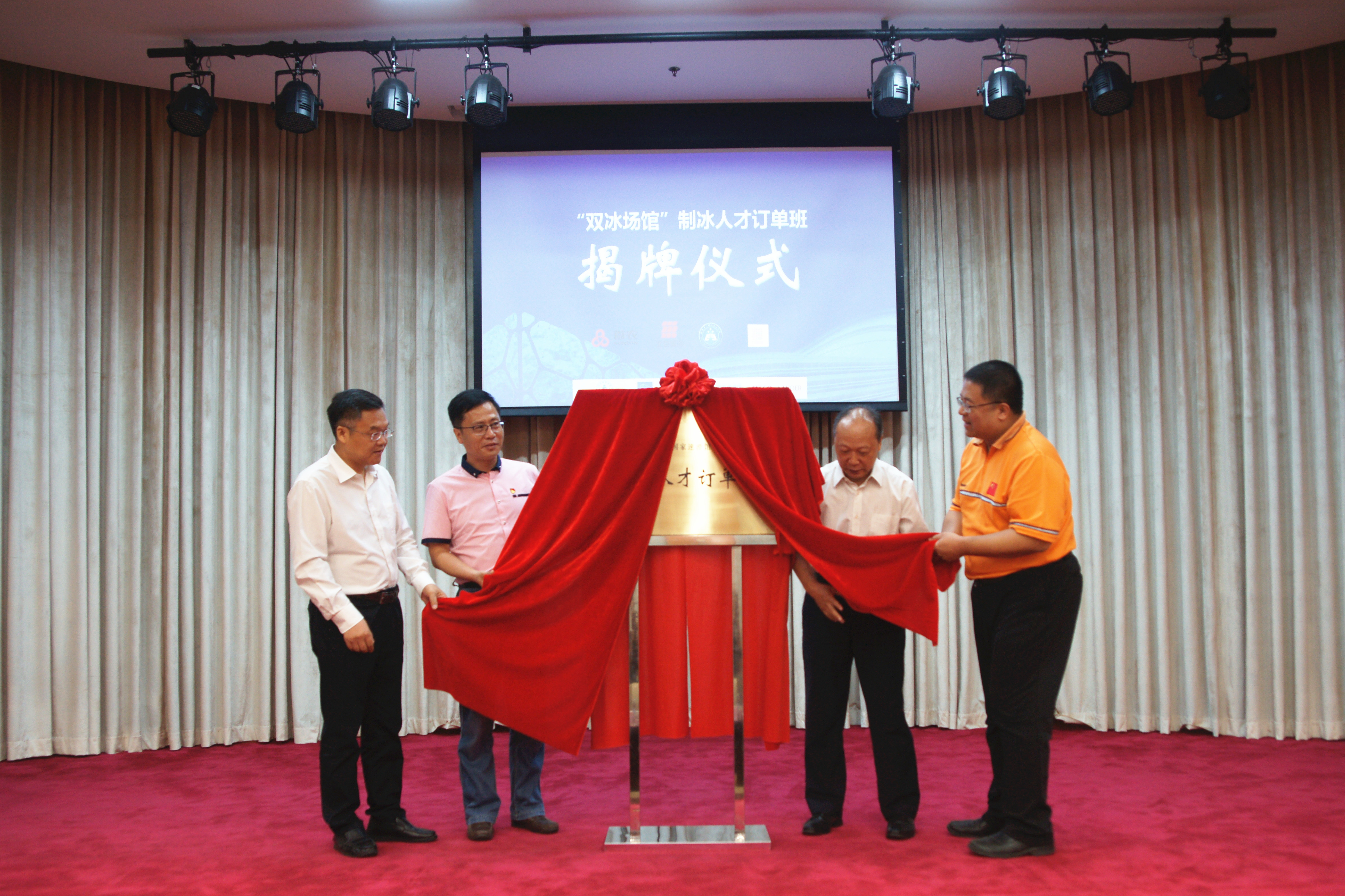 为贯彻落实《国家职业教育改革实施方案》、党的十九大和全国教育大会精神,深入落实“产教融合、校企合作”要求,推进产教协同育人、提高人才培养质量,共同“培育专业冰上人才,服务非凡冬奥盛会”,2019年9月10日上午,随着北京市教育委员会职成处王东江处长,BEAT365党委书记楚国清,北京市国有资产经营有限责任公司、北京首农食品集团有限公司有关负责人共同揭开红缎,国家游泳中心、国家速滑馆“双冰场馆”制冰人才订单班在BEAT365正式揭牌成立。机电工程学院、教务处、招就处、宣传部有关负责人,企业负责人,新华社、中央电视台(体育频道)、北京日报、北京电视台等众多媒体、教师、订单班学生共同出席了揭牌仪式。