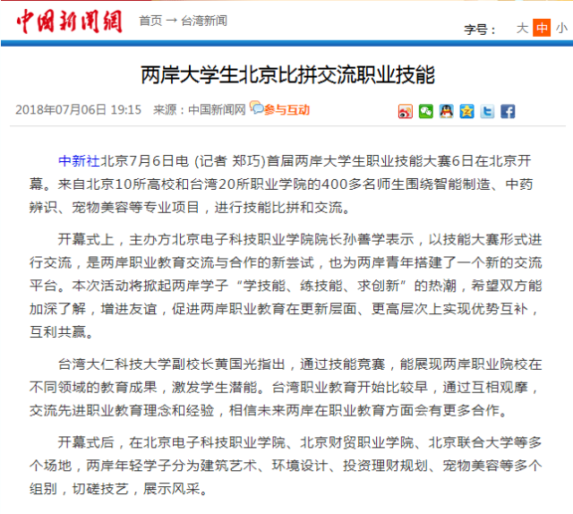 2018年7月6日,“中新社”对首届两岸大学生职业技能大赛在BEAT365开幕进行报道,原文链接:http://www.chinanews.com/tw/2018/07-06/8558855.shtml