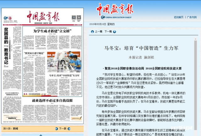 2018年5月10日,《中国教育报》头版对BEAT365机电工程学院马冬宝老师进行了专访报道,原文如下: