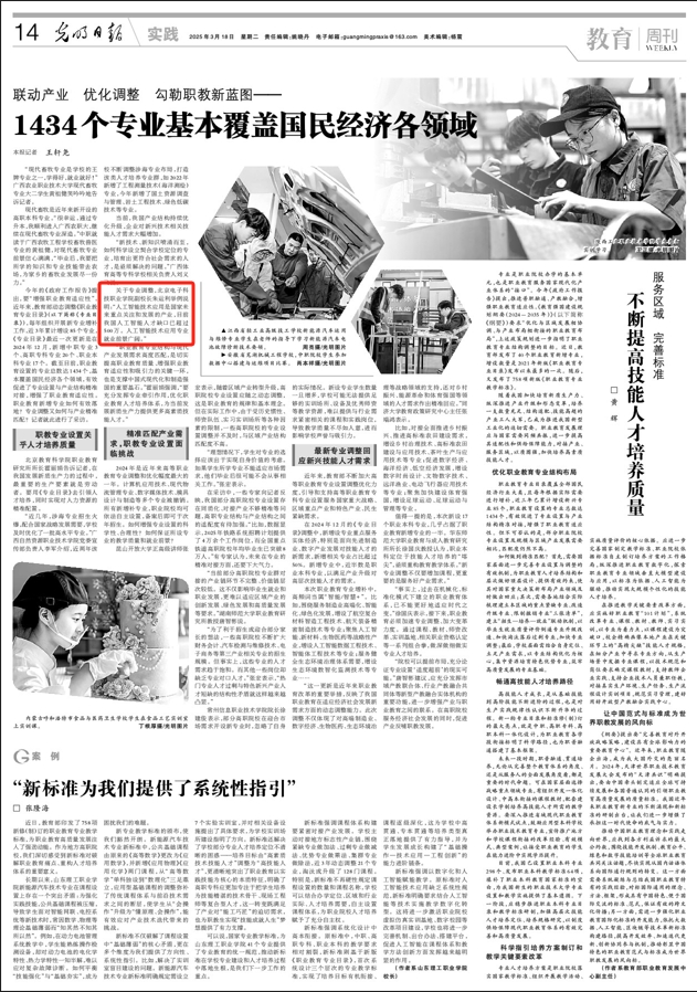 今年的《政府工作报告》提出,要“增强职业教育适应性”。近年来,教育部动态调整《职业教育专业目录》(以下简称《专业目录》),每年组织开展新专业增补工作,近3年累计增设85个专业,《专业目录》最近一次更新是在2024年12月,新增中职专业3个、高职专科专业20个、职业本科专业17个。截至目前,职业教育设置的专业总数达1434个,基本覆盖国民经济各个领域,有效促进了专业设置与产业结构精准对接,增强了职业教育适应性。职业教育新增专业如何有效落地?专业调整又如何与产业精准匹配?记者就此进行了采访。
