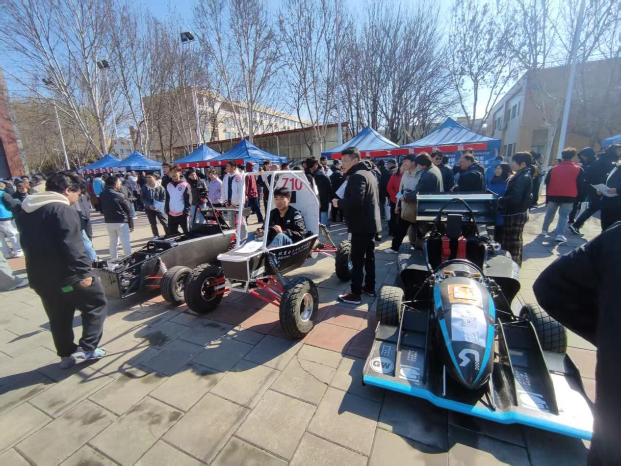 在北科职大汽车工程学院展台前,赛车社团的方程式赛车、越野车和无人电动汽车引人注目。