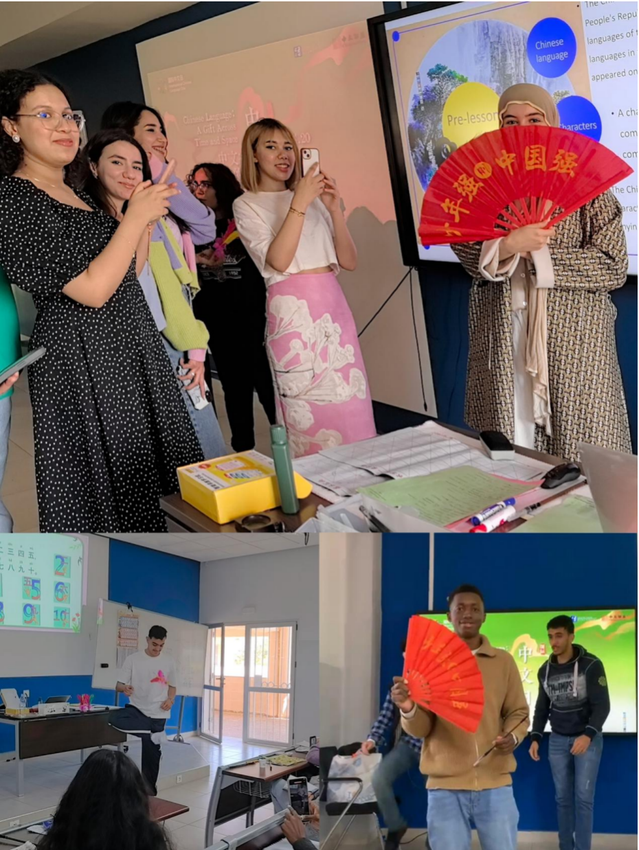 活动期间,哈桑一世师生体验了中国传统扇子舞,并学习歌曲《上春山》,学生迅速融入节奏,边演唱边跟随旋律进行课桌舞。踢毽子环节更是热闹非凡,学生们在“踢、拐、盘”的动作中感受中国民间体育的趣味。“没想到小小的羽毛能带来这么多欢乐!”哈桑一世大学学生Amamou Hamza兴奋地说。