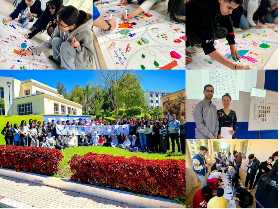 两校师生在哈桑一世大学副校长Abderraouf Hilali、商管学院院长Rachid Oumlil以及《今日中国》摩洛哥读者俱乐部主席Fouad Larhzizer等教师带领下,漫步哈桑一世大学春日校园,实地体验中国“踏青”习俗。活动中师生识读了24节气卡片、参加了24节气转盘挑战赛,并且共同绘制了一幅长达5米的24节气长画卷,中国青花瓷的“天青色”与摩洛哥舍夫沙万“蓝色”交织晕染,梯田、茶树与椰枣树、几何纹样共绘文明交融。