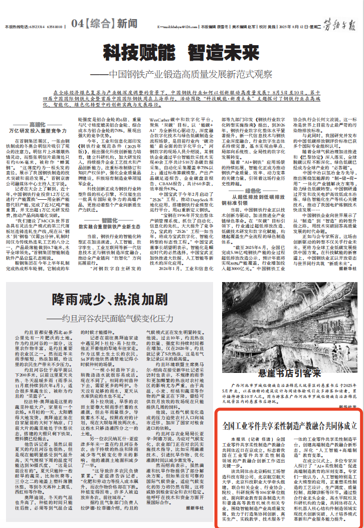 【劳动午报】全国工业零件共享柔性制造产教融合共同体成立